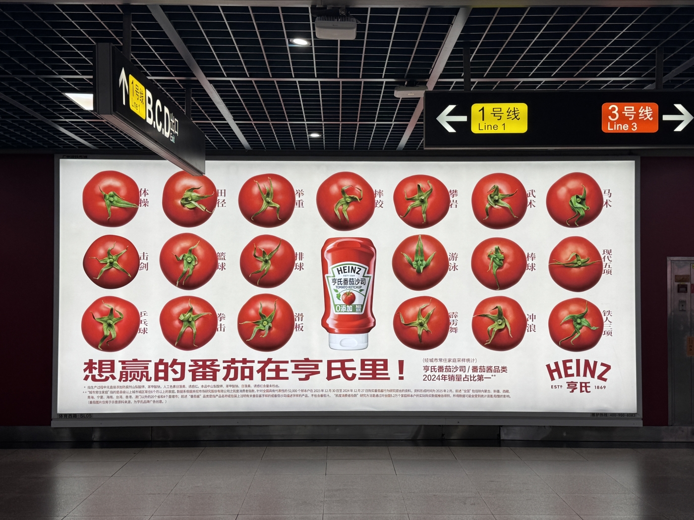 광저우 지하철을 가득 채운 하인즈 광고는 처음엔 그저 잘 익은 토마토 34개를 나열한 것처럼 보였습니다. 하지만 자세히 들여다본 사람들은 놀라운 디테일을 발견했습니다. 토마토 꼭지(stem)가 전국체전 34개 종목 선수들의 역동적인 모습으로 디자인되어 있었던 것입니다.