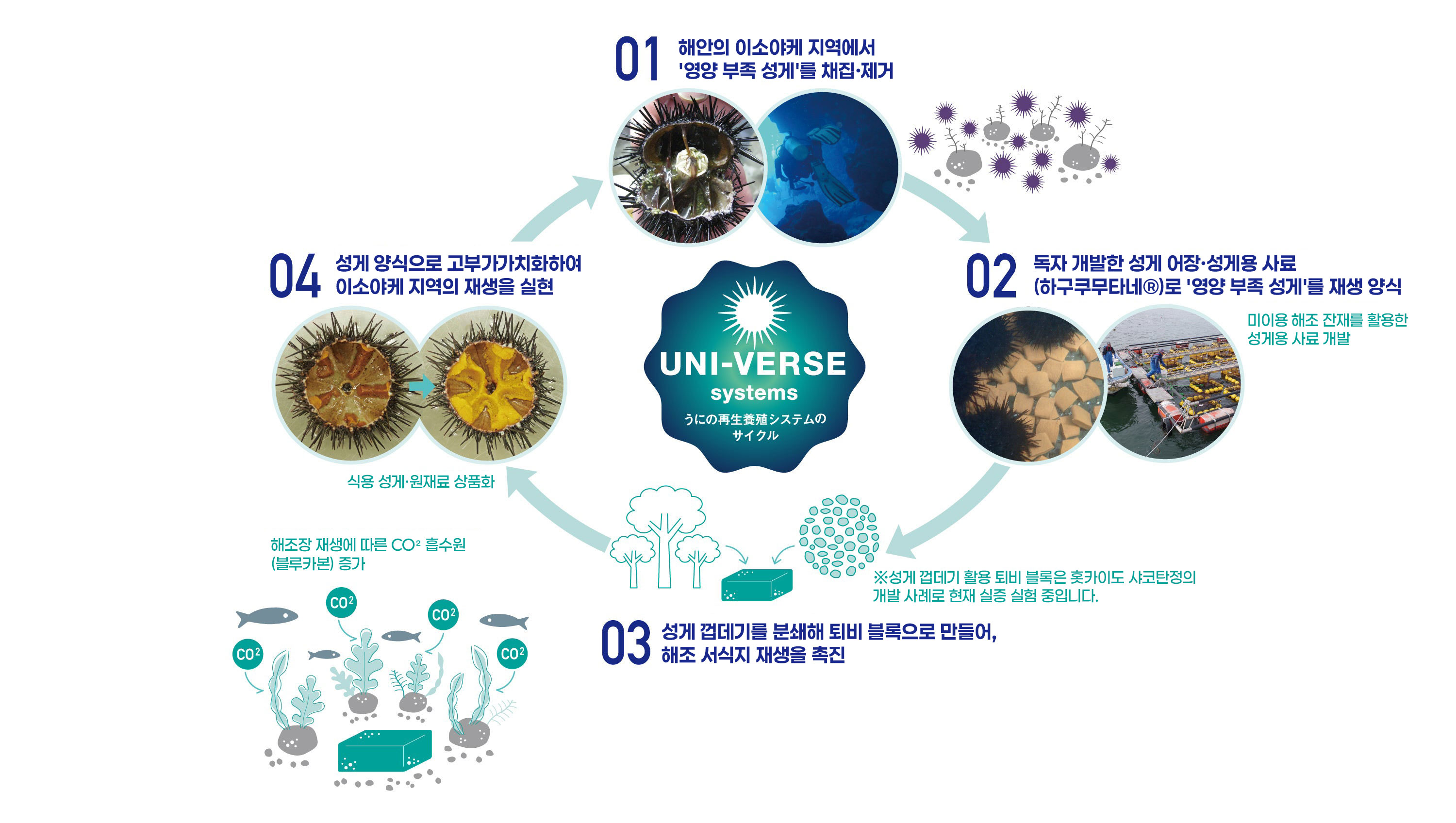 이 시설에서는 기타 산리쿠 공장(北三陸ファクトリー)가 홋카이도대학 대학원 수산과학연구원과 7년 이상 공동 개발한 '유니버스 시스템(UNI-VERSE systems®)'이 실증됩니다. 이 시스템은 바다 사막화인 '이소야케(磯焼け)' 지역에서 구제·폐기되던 실입이 나쁜 성게를 단기간의 급이로 품질을 대폭 개선하는 특허 기술을 핵심으로 합니다.