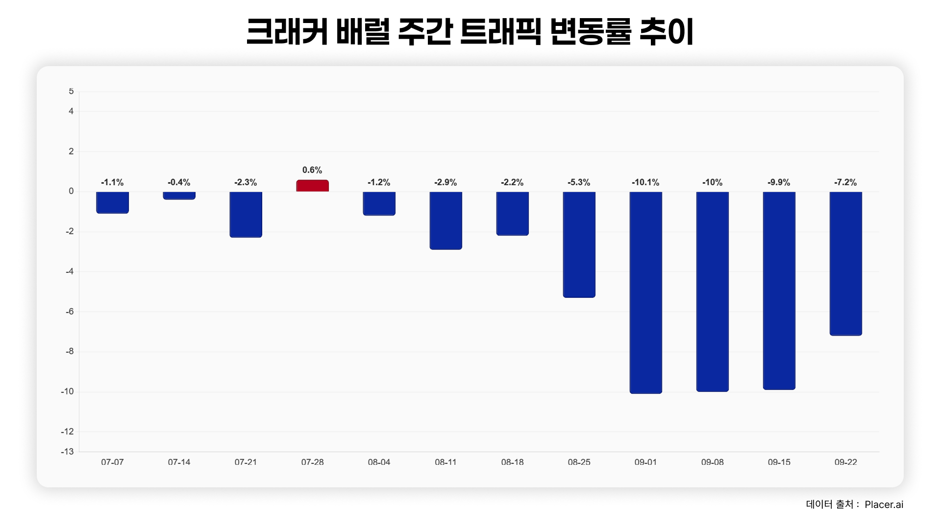 단순한 비난 여론이 아니었습니다. 트래픽 데이터 분석 업체 플레이서닷에이아이(Placer.ai)에 따르면, 논란이 최고조에 달했던 8월 25일 주간의 매장 방문객 수는 전년 동기 대비 5.3%나 급감했습니다. 여름 초만 해도 1~2% 감소에 그쳤던 수치가 순식간에 악화된 것입니다. 9월에는 감소폭이 10%까지 치솟으며 위기감은 극에 달했습니다.