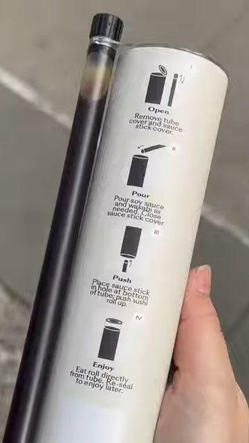 사람들이 지갑을 여는 이유는 단 하나, '스시 푸시팝(Sushi Push Pop)'이라 불리는 특허 출원 중인 독특한 포장 용기 때문이다. 이들은 미리 썰어둔 스시롤을 원통형 판지 튜브에 담았다. 립스틱을 돌리듯 아래쪽 막대를 밀어 올리면 스시가 한 입 크기로 쏙 올라온다. 젓가락질도, 간장 종지도, 앞접시도 필요 없다. 튜브 하단에 내장된 간장을 뿌리고 한 손으로 들고 길거리를 걸으며 사탕처럼 먹으면 그만이다.