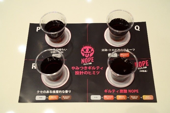 발표회장에서는 이 복합적인 맛의 구조를 혀로 직접 확인하는 4단계 시음 코너가 운영됐다. 베이스 맛만 담은 샘플 P에서 시작해 과일 플레이버를 더한 샘플 Q, 스파이스·바닐라계 향을 추가한 샘플 R을 거쳐 모든 요소를 통합한 완성품 NOPE로 마무리하는 순서였다. 한 모금씩 마실 때마다 향의 층위가 쌓여가는 과정을 참석자들은 단계적으로 실감했다.