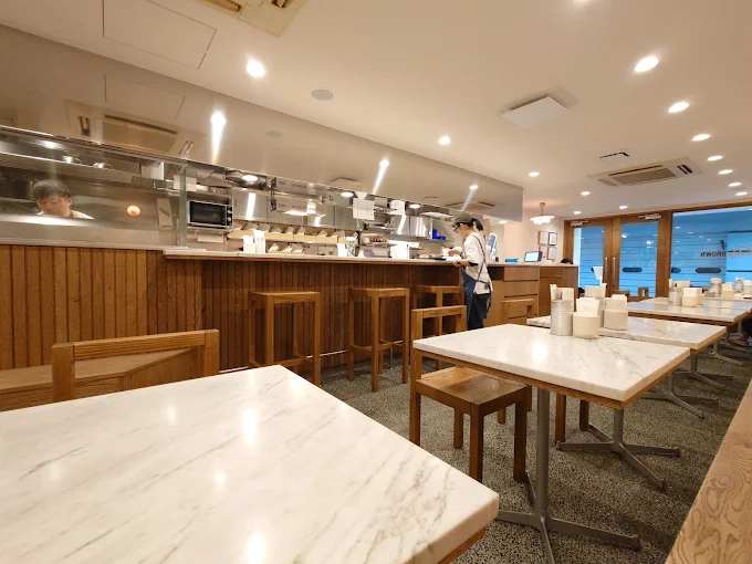 매장 내부는 대리석 테이블과 오크 가구가 베이스를 이루고 사이키델릭(psychedelic) 패턴 유리 갓 조명과 자갈 바닥이 감각적인 층위를 더한다. 버거를 팔기 위한 공간이 아니라 특정한 미적 경험을 파는 공간이다. 식재료와 공간이 같은 언어로 말할 때 브랜드 내러티브가 완성된다.